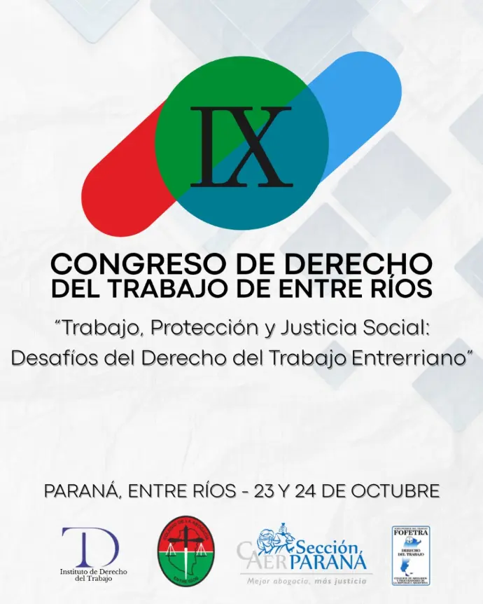 El congreso será organizado por el Colegio de la Abogacía de Entre Ríos y su Sección Paraná, y se llevará a cabo los días 23 y 24 de octubre de 2025 en Paraná. El objetivo del evento es generar un espacio de análisis, formación y reflexión sobre los desafíos actuales del Derecho del Trabajo.